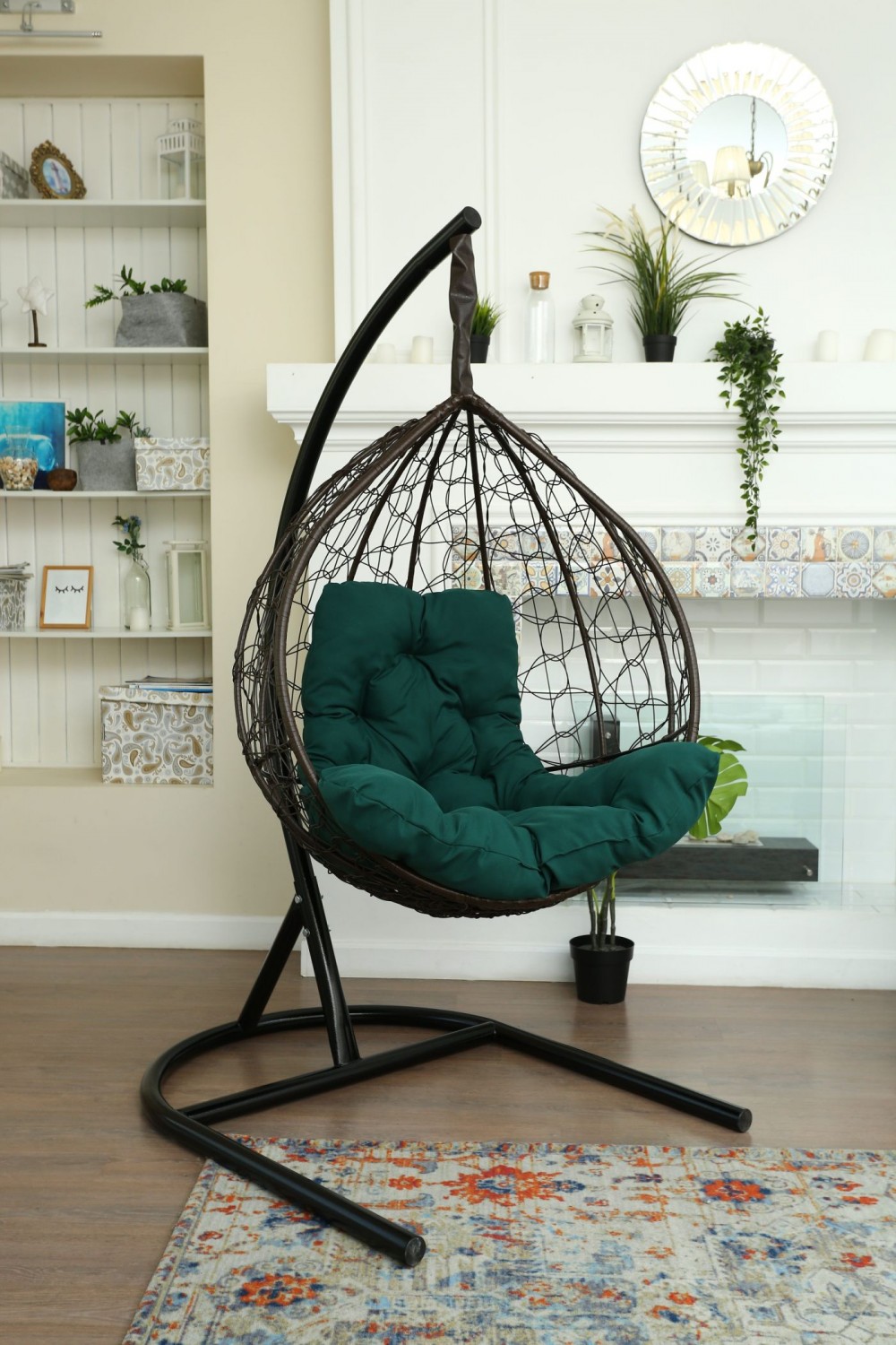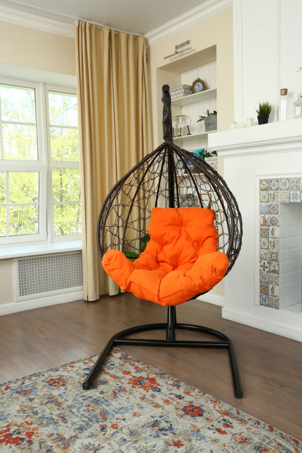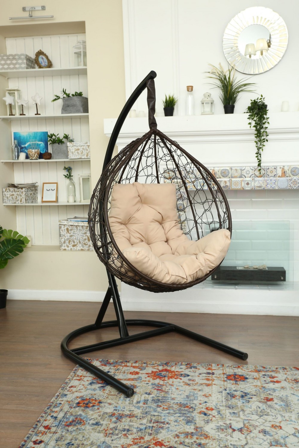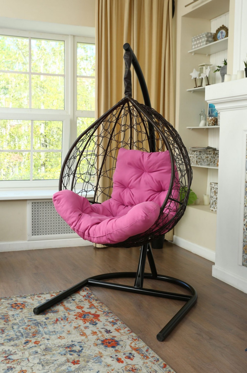 Стойка - стальная диаметр 51 мм, толщина 3 мм. Покрытие порошковой краской. Кокон - стальной каркас с оплетенным экоротангом. Подушка из Габардиновой ткани.